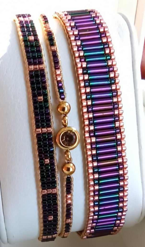 Ta delikatna bransoletka, tkana z dwóch rodzajów koralików Miyuki to prawdziwy klejnot. Jest subtelna i elegancka, idealna jako uzupełnienie popołudniowego stroju. W dziennym świetle odcienie fioletu przepięknie opalizują odkrywając subtelną domieszkę koloru ciemnoróżowego, z odrobiną głębokiego granatu, a czasem również butelkowej zieleni. Wszystko wykończone koralikami w kolorze różowego złota.