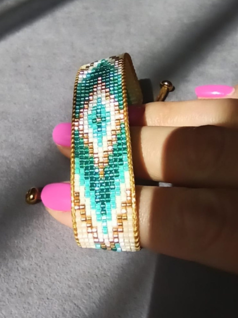 Bansoletka tkana w stylu boho Azure Vibes to połączenie delikatnych niuansów turkusu, jak morskie fale, ze swobodnym, graficznym wzorem, charakterystycznym dla boho chic. Każdy wątek wpleciony jest z precyzją, tworząc unikalny design, który emanuje lekkością i spokojem.